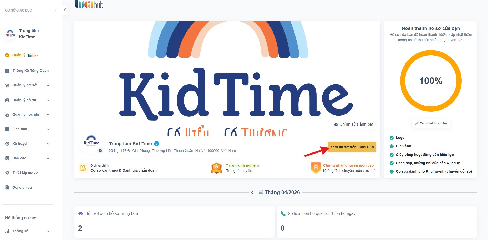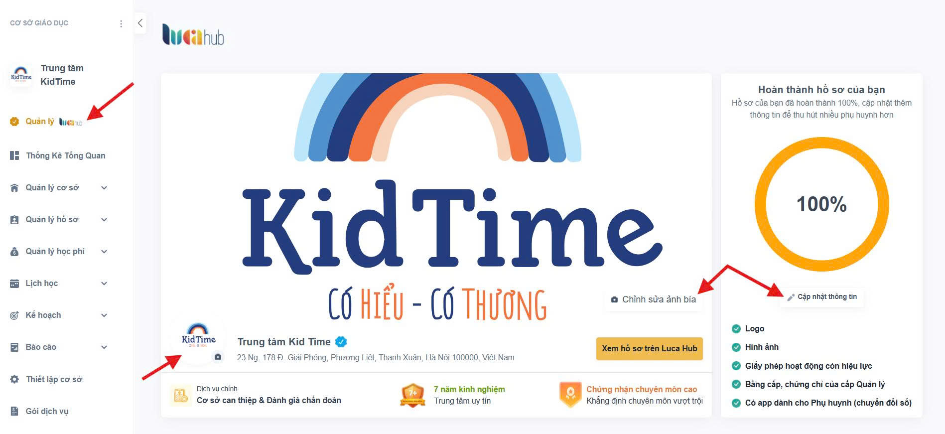Sau khi đã kích hoạt tài khoản Luca Education, bạn truy cập vào trang <mark style="color:$warning;">**Quản lý Luca Hub**</mark> của trung tâm để cập nhật thông tin và hoàn thiện hồ sơ, bao gồm:&#x20;