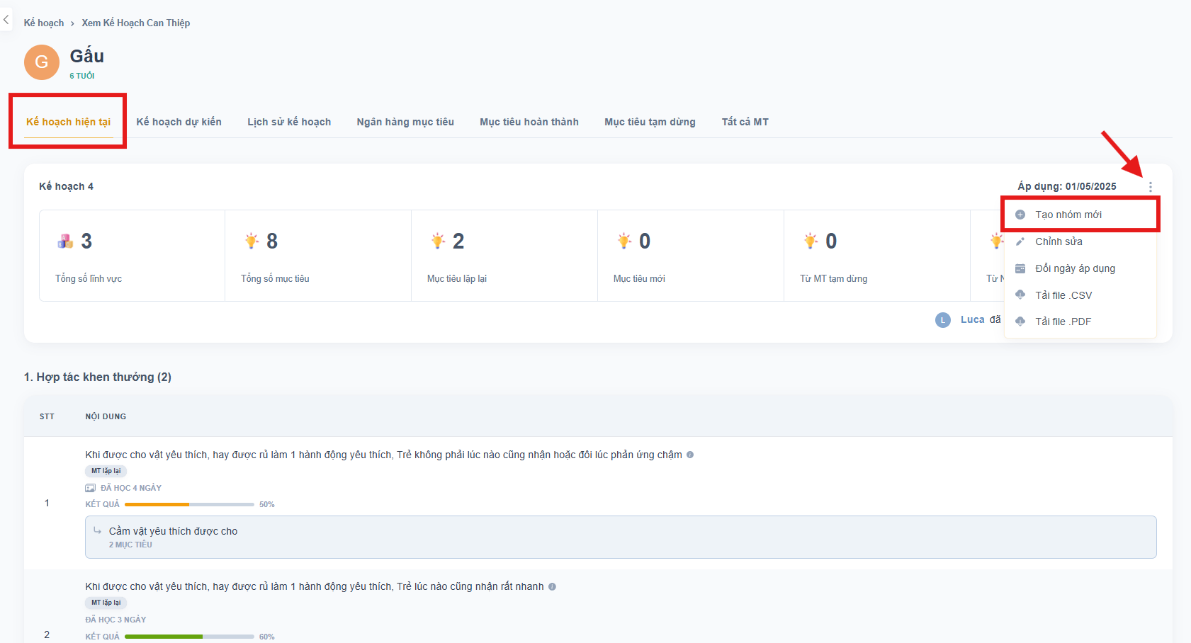 * Kế hoạch hiện tại là kế hoạch **đang được dạy** và chứa các mục tiêu có thể **báo cáo kết quả** hàng ngày trên app Trị liệu viên